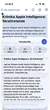 Givetvis lät jag Apples AI korrekturläsa även denna krönika innan jag publicerade den. Den missade alla mina medvetna fel, (en särskrivning av “under tecknar” och felskrivningen “porocent” men ändrade Iphone till iPhone och Ipad till iPad. Så jag fick korra Apple Intelligences korr manuellt.