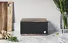 Högtalaren finns i tre färgval som alla har träpaneler på ovan- och undersidan. Eller, det är inte äkta träpaneler, men jag måste verkligen detaljstudera dem för att försäkra mig om det, så känslan av träpanel har de verkligen fångat, i svart, valnötsfärgat eller solblekt drivvedsljust. Väven som täcker högtalarelementen är också snygg. En aluminiumpanel innehåller knapparna. Av/på, ihopparning och volymknappar. Volymknapparna har sitt eget liv och du kan alltså vrida upp volymen till max på mobilen utan att du vridit upp högtalaren på max. Den enda övriga inställningen är ett skjutreglage på baksidan som avgör om högtalaren alltid är tillgänglig för uppkoppling eller om den stänger av sig vid inaktivitet så att du måste trycka igång den igen med av/påknappen.
