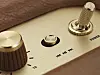 Själva högtalaren lånar formgivning och materialval från den klassiska förstärkartillverkaren och det innebär mässing- och läderimitationer. Det ger onekligen Marshalls produkter en egen identitet och på toppen av högtalaren finns en panel med skruvknappar och spakar. Först och främst har vi tre skruvknappar med lysdioder som låter dig justera volym, bas och diskant. Det går att göra även i appen och när jag ändrar till exempel basen i appen ser jag hur dioderna på högtalaren indikerar att jag höjer eller sänker. panelen rymmer även en av-på-spak, anslutning för 3,5-millimeterskontakt om du vill lyssna från en annan källa än trådlöst via bluetooth och här finns en liten flervalsknapp som låter dig spela, pausa samt spola framåt och bakåt.