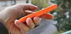 Annars är bygget typiskt Nokia, även om det numera är Microsoft står det fortfarande Nokia på mobilen. Rejält och plastigt. Telefonen finns i skrikig orange och grön och mer diskret svart och vit. När jag pratar i vårt orange testexemplar kommer jag då och då på mig med att undra vad det är för lampa som lyser i ögonvån. Det är skalet.